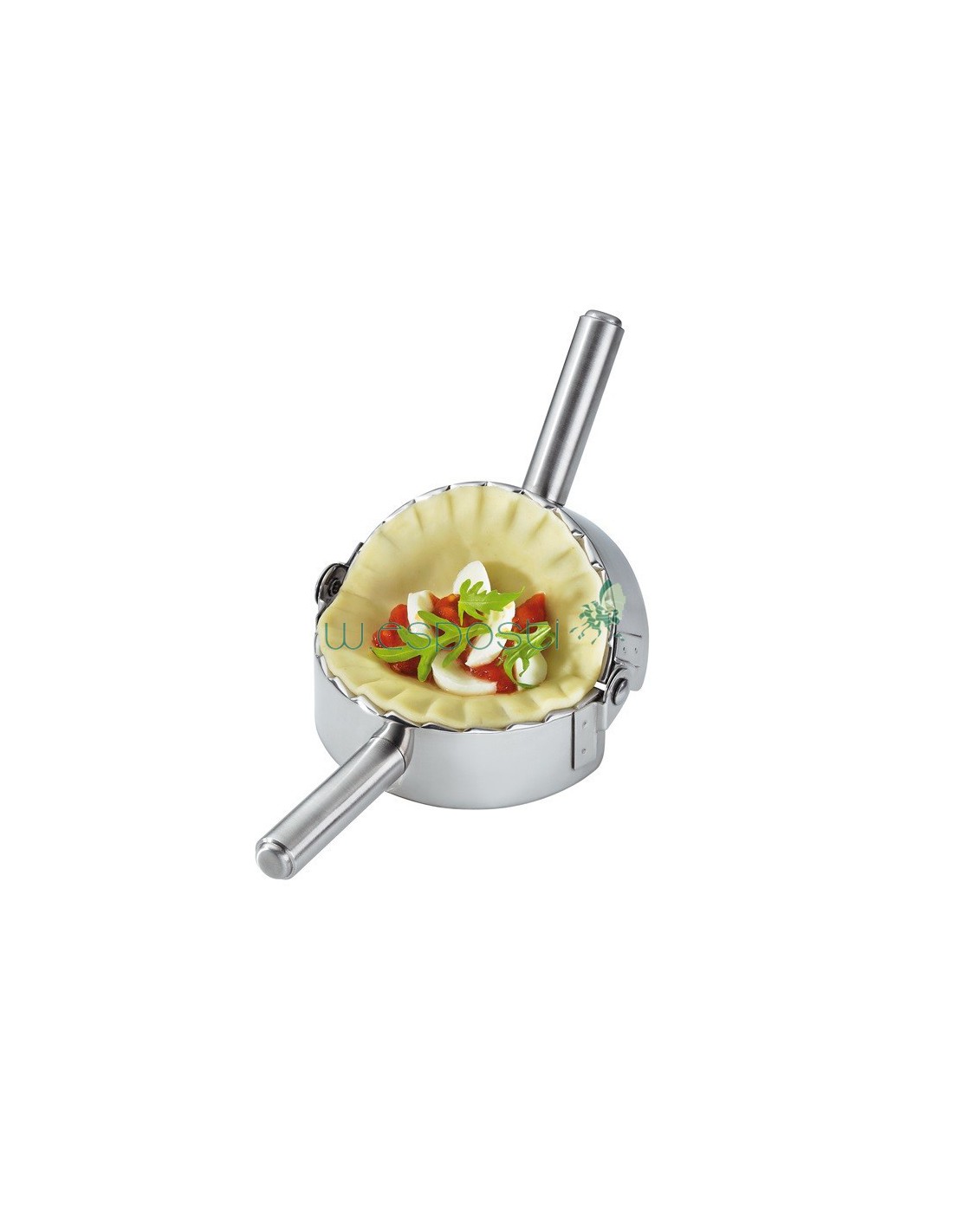 Usarlo è semplicissimo: una volta stesa la pasta con la parte inferiore si taglia il cerchio, lo si pone sullo stampo aperto , si farcisce et....voilà il gioco è fatto !
