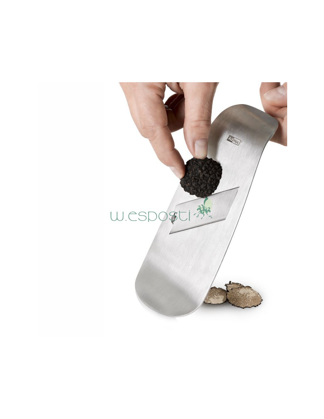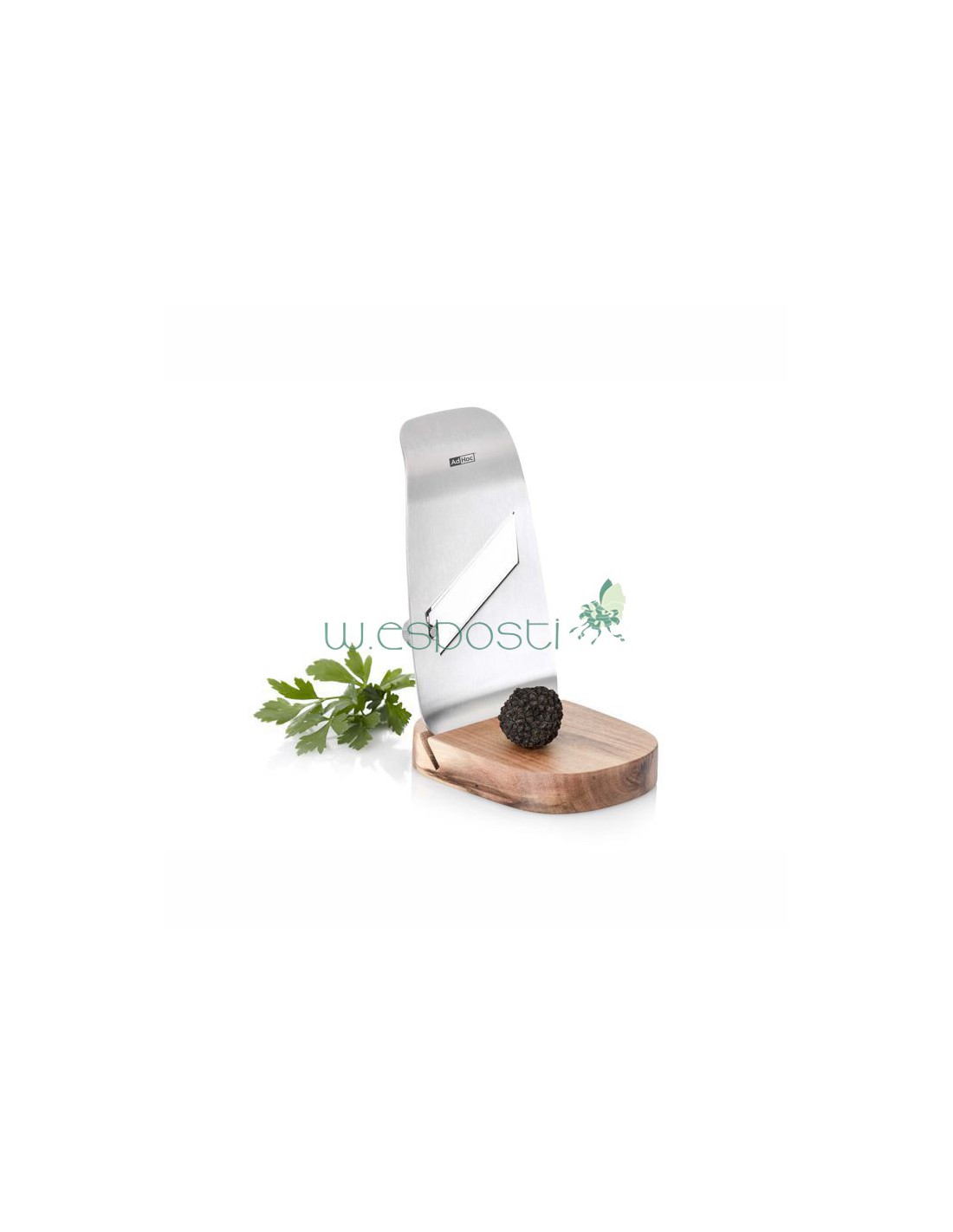 Nuovo affetta tartufi di AD HOC - TUFO - in acciaio inossidabile su base di legno d'acacia con il suo speciale design leggermente curvo può essere utilizzato anche per i funghi,il parmigiano, il cioccolato