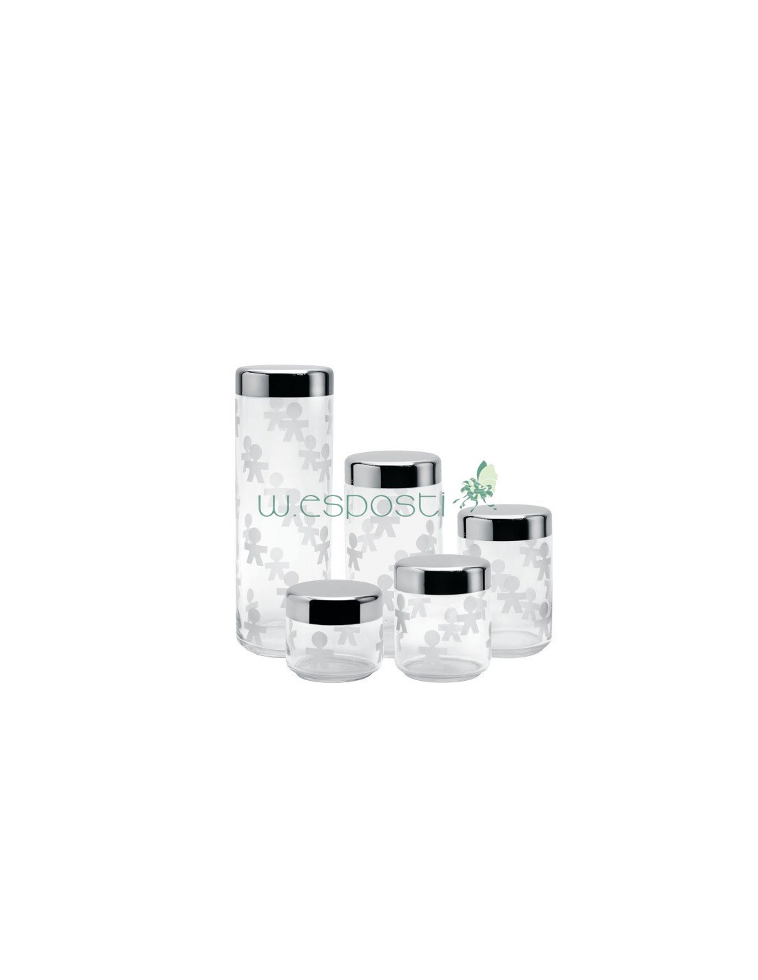 Dalla celeberrima serie "Girotondo" creata dal duo King-Kong (Giovannoni e Venturini)  neglia anni '80 per Alessi, la serie di barattoli ermetici in vetro serigrafato e coperchio in