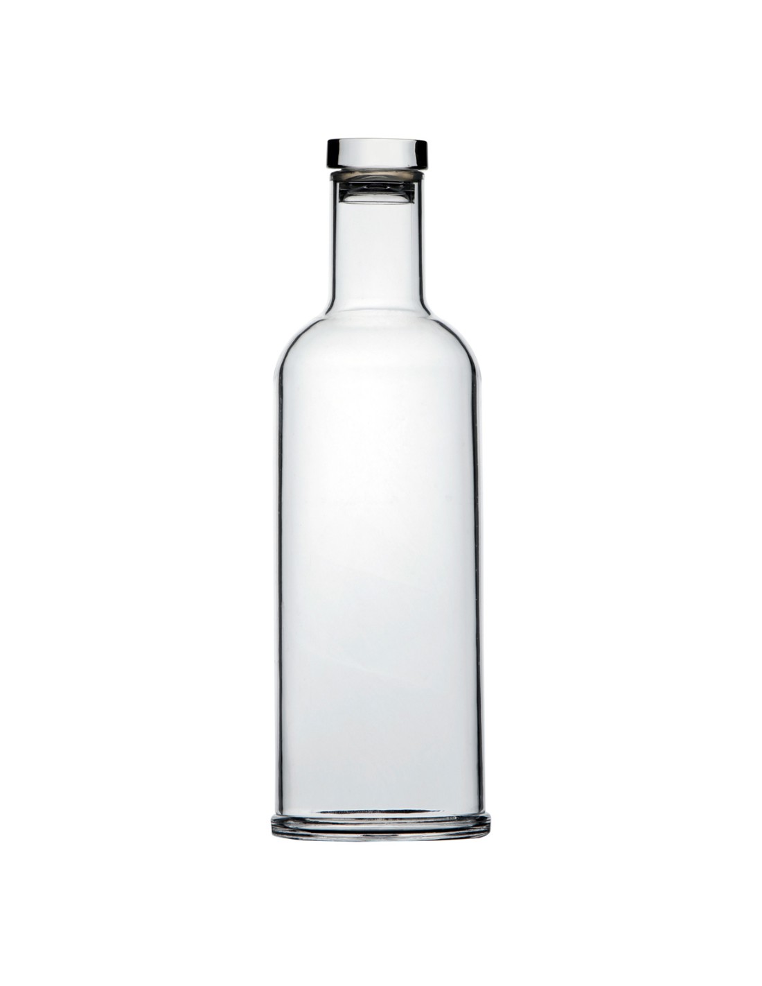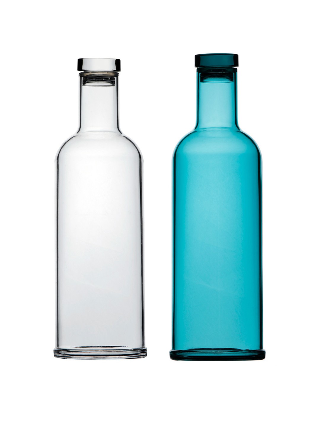 Bottiglie da acqua/vino in metilstirene, un innovativo materiale di altissima qualità, di aspetto identico al cristallo più puro, resistente ad urti e graffi.