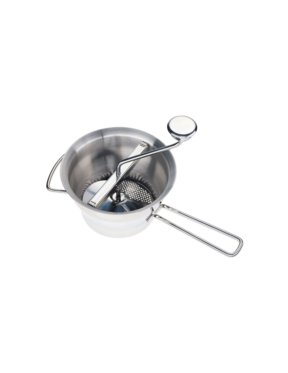 Eccezzionale passaverdure dotato di tre dischi forati (da 5, 3 e 2 mm) e uno grattuggiante che permettono di grattuggiare sia verdure fibrose che alimenti con la buccia dura come mele o pomodori.