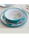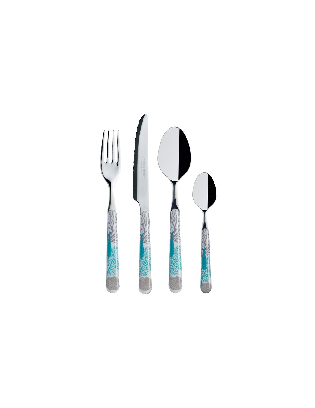Il servizio di posate è in acciaio inox con il manico in ABS ed è composto da cucchiaio-forchetta-coltello ( seghettato) e cucchiaino per 6 persone