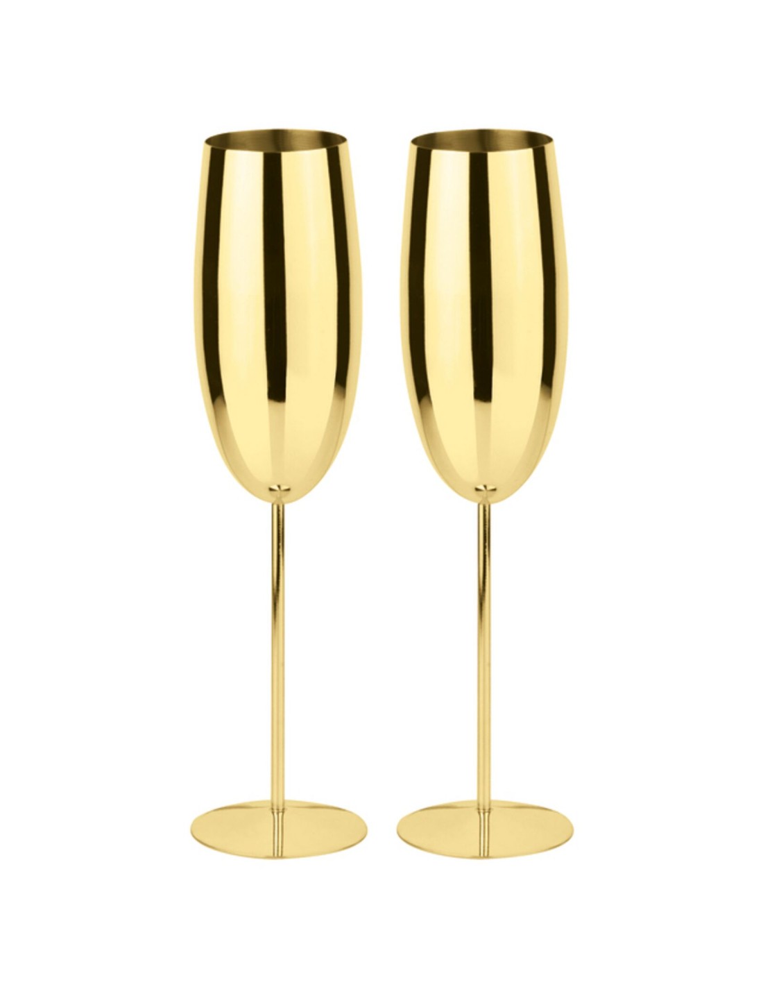 Elegante set di due calici flute in acciaio inox finitura PVD al vapore per prosecco, champagne, aperitivi.