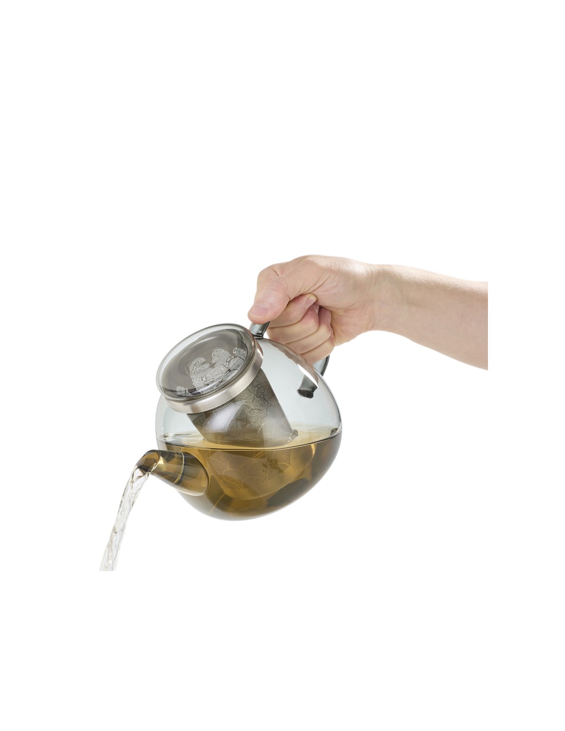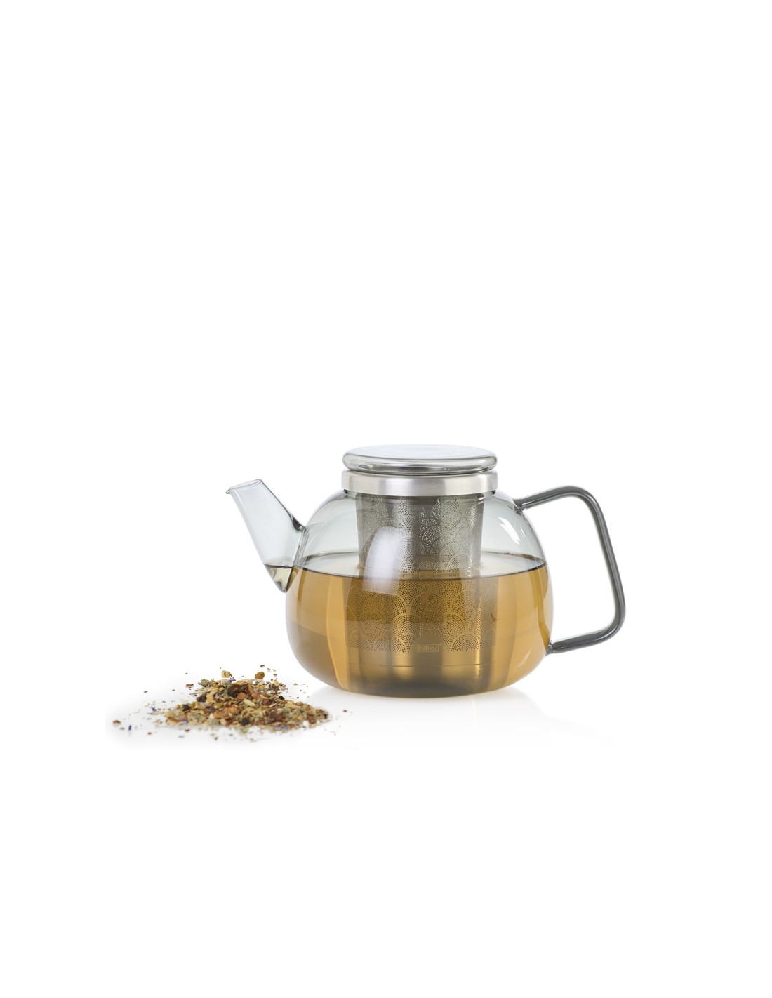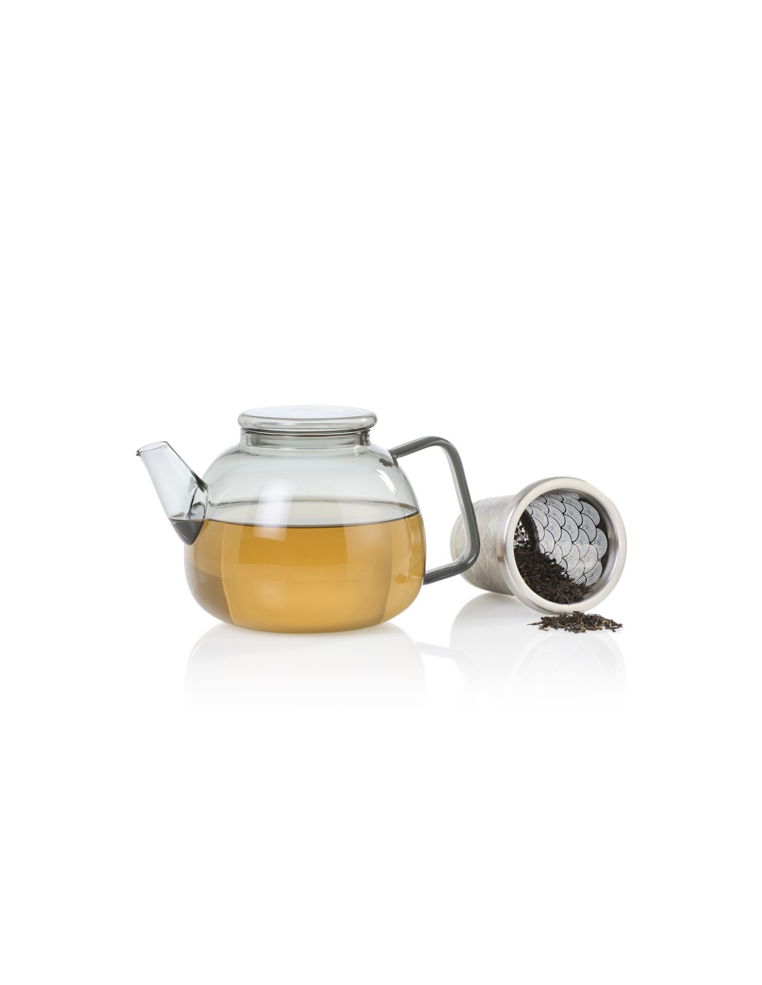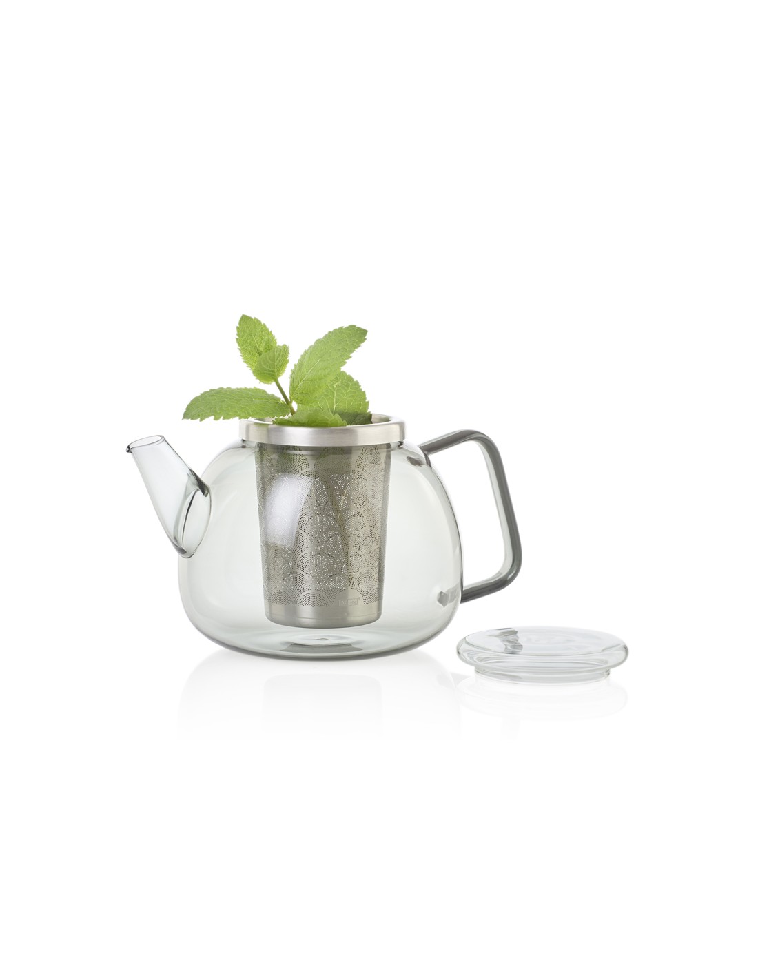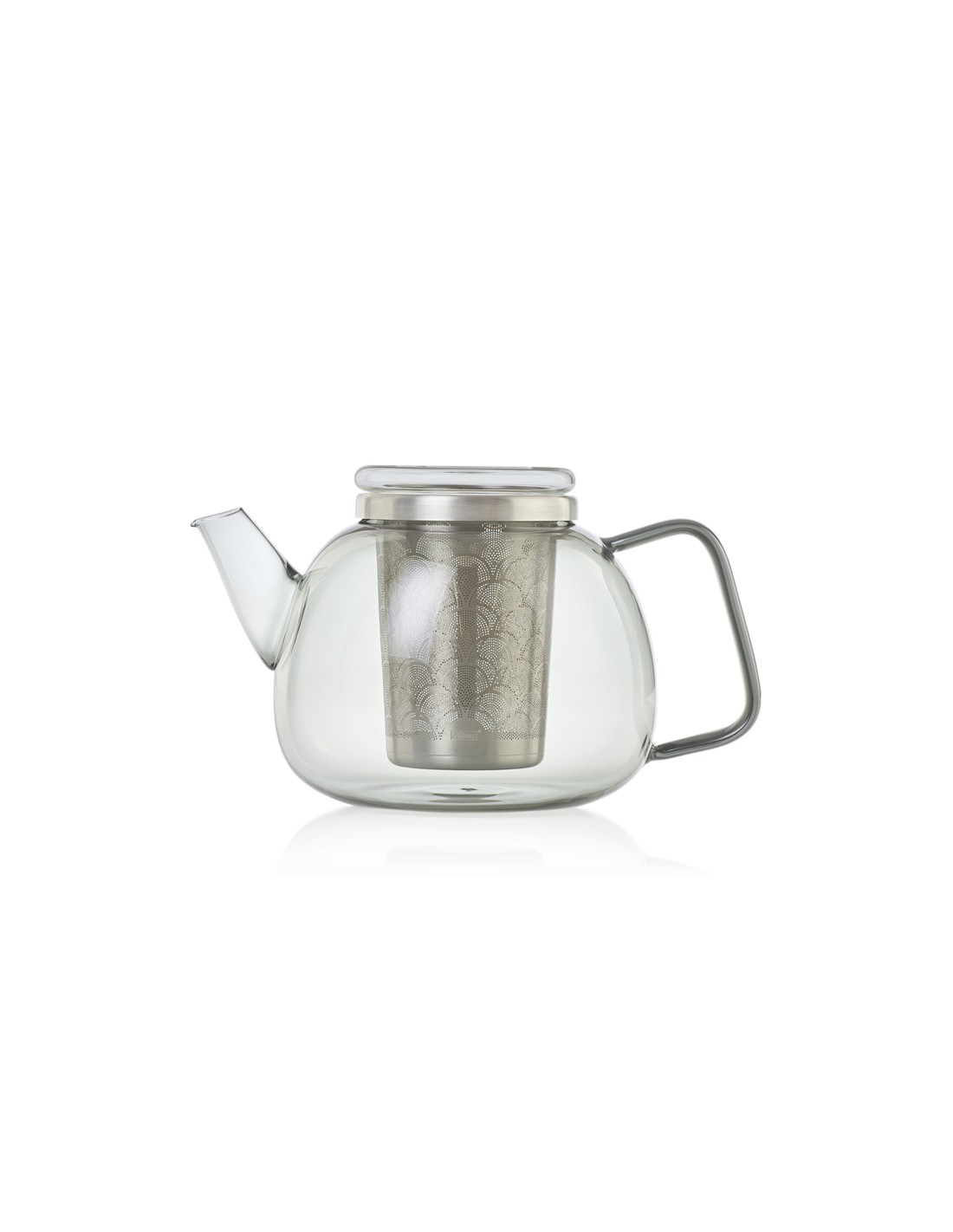 Teiera Yuna in vetro borosilicato grigio con infusore in acciaio inox, dalla linea elegante e senza tempo.