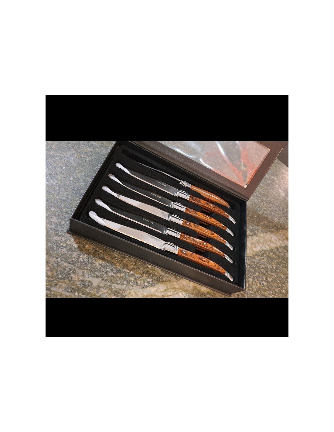 Set di eleganti coltelli da carne e da tavola dalla linea sinuosa che ben si accosta anche alle posate più eleganti.