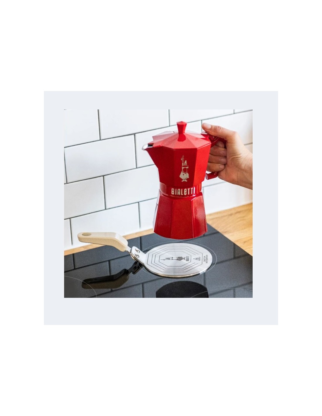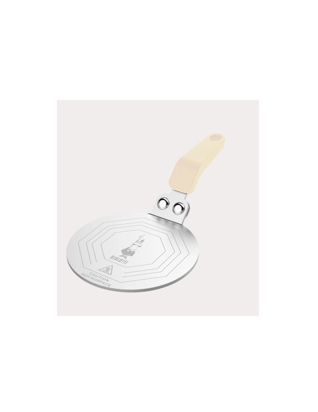 l piattello per induzione con manico color crema è il perfetto abbinamento per chi ha una Moka Exclusive e una cucina a induzione.