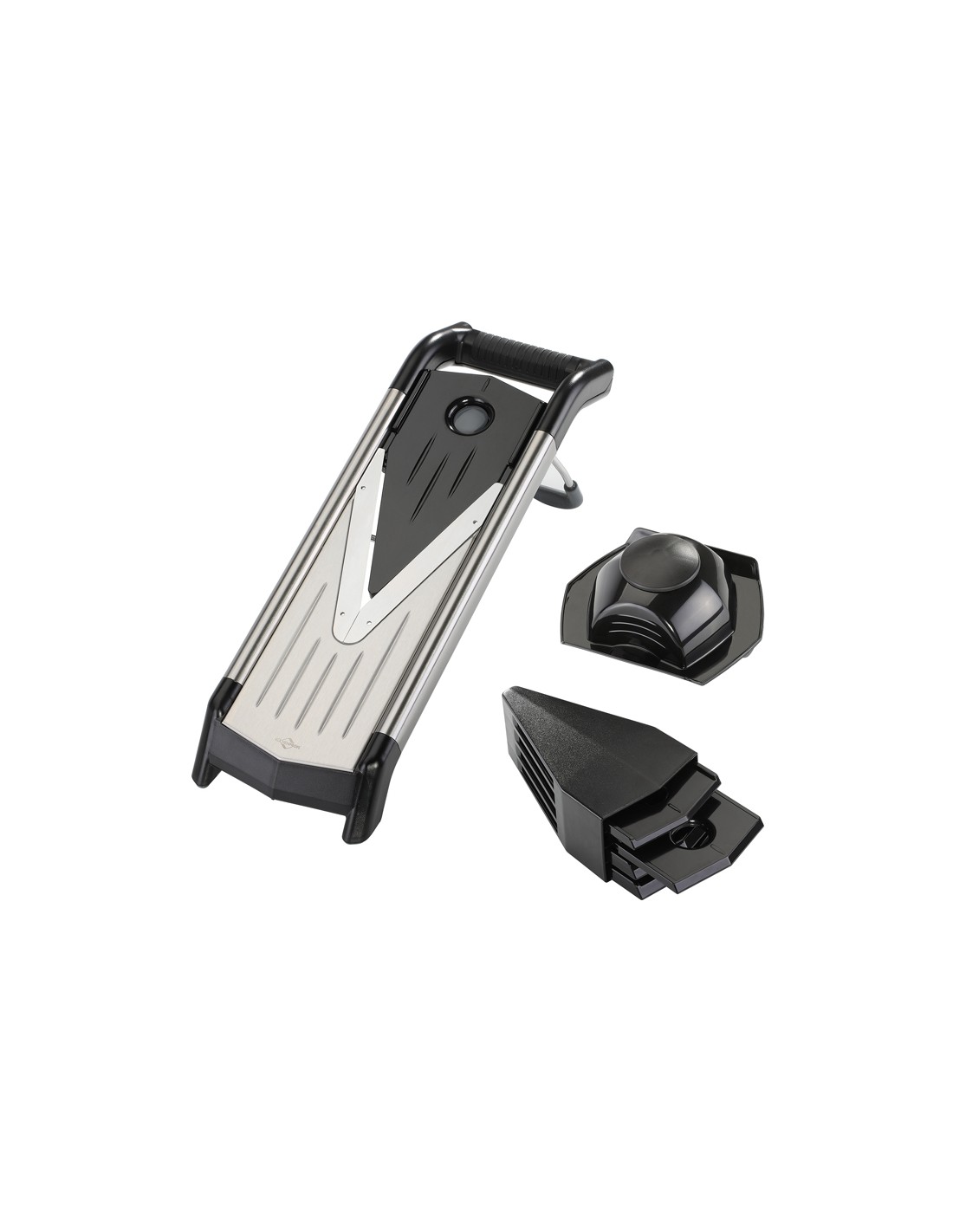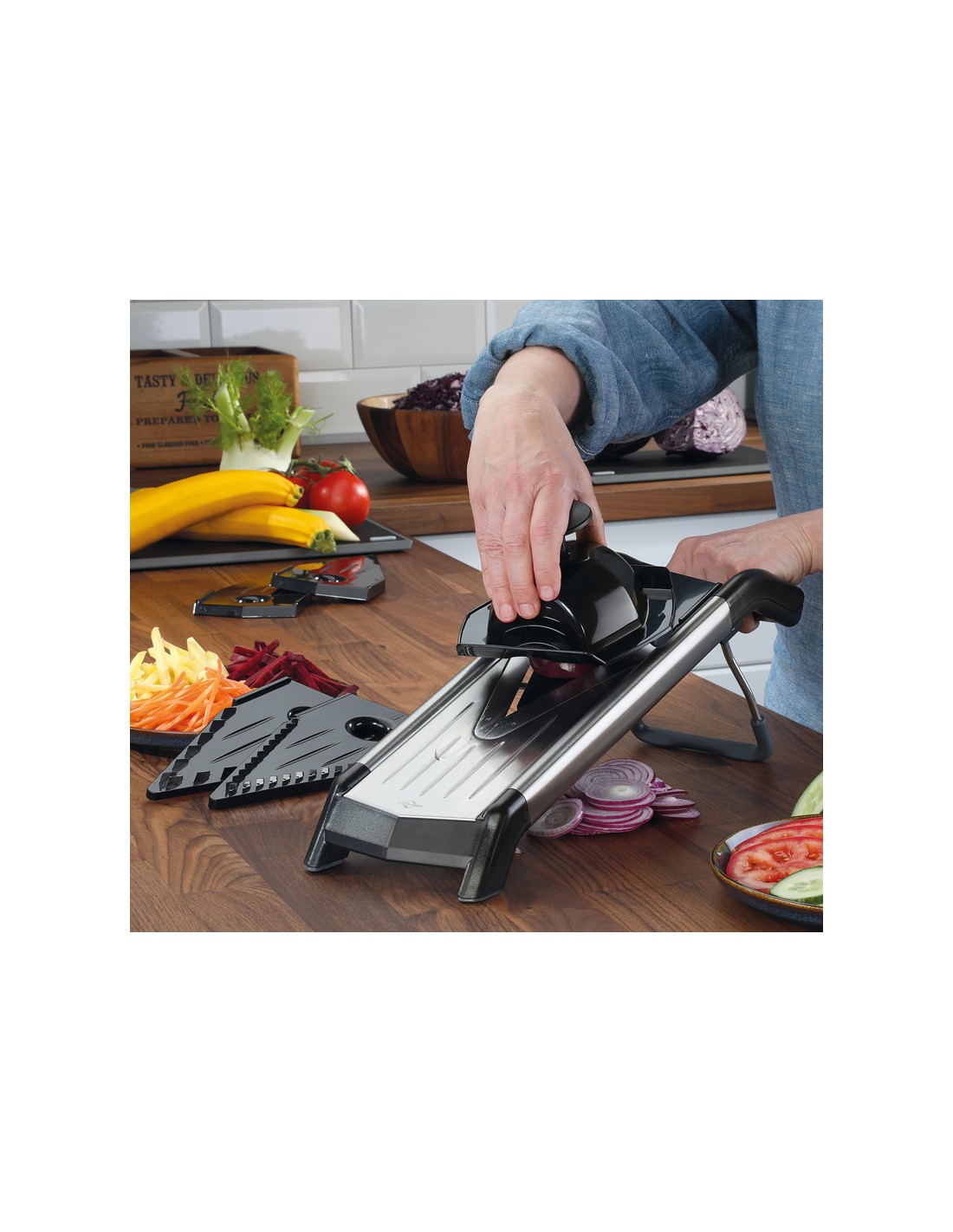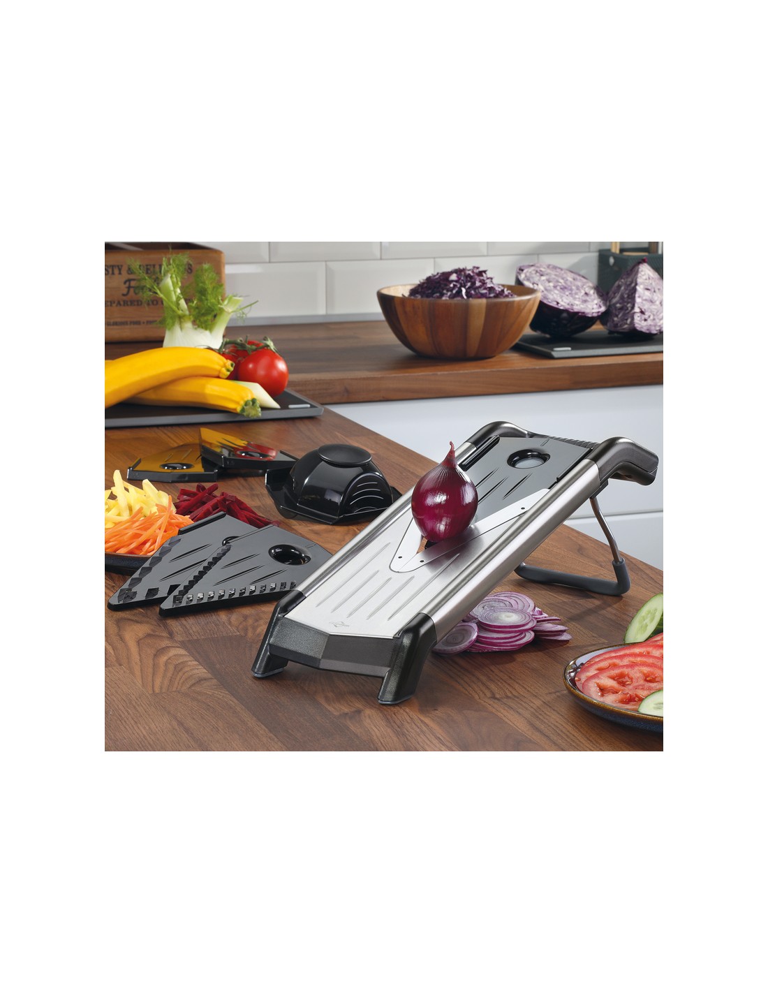 Questa mandolina ti permette di sbizzarrirti con le amate verdure, dando loro 5 tagli diversi: 2 inserti taglia julienne(3,5mm e 7,5mm) e 3 insertu taglia fette (1,5 mm, 2,5 mm e 3,5 mm).