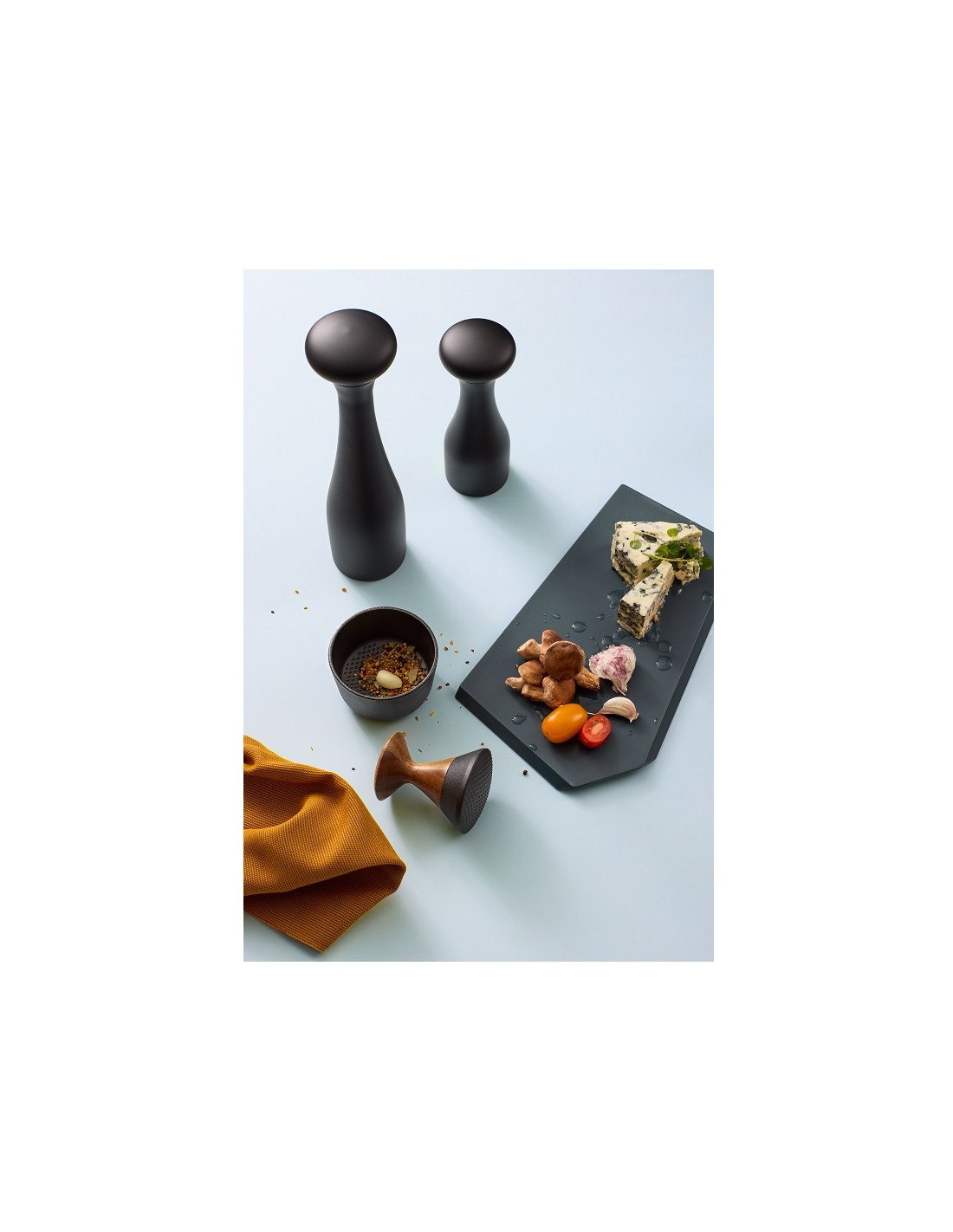 L'anima del suo design sta nel punto di contatto tra pestello e mortaio: la superficie interna concava del recipiente è infatti finemente incisa con un motivo a rilievo, mentre la testa del pestello è