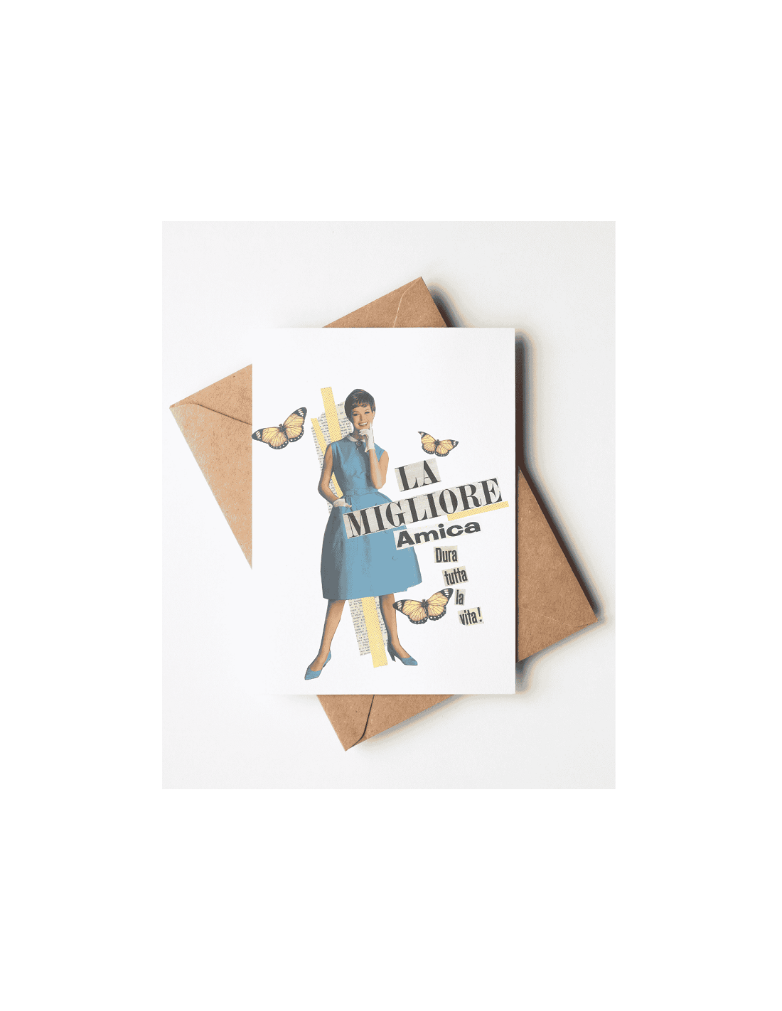 I biglietti di auguri Collage Vintage di Maria Grazia Preda nascono dal recupero creativo di riviste originali degli anni ’50, un’epoca d’oro per la grafica pubblicitaria, la moda e il