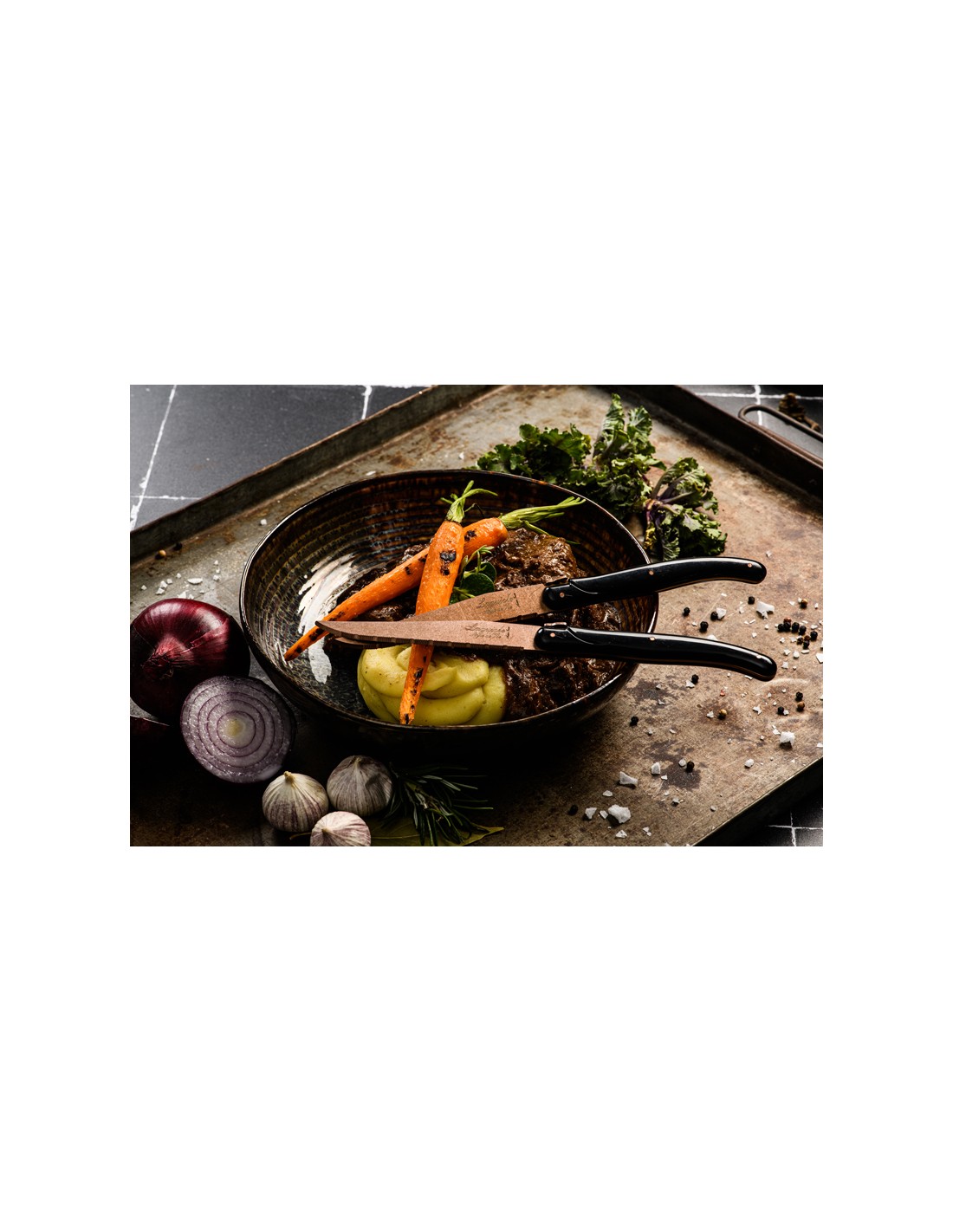 Grazie alla lama in acciaio inox color rame abbinata al manico in resina nera, questi coltelli da bistecca sono un vero colpo d'occhio.